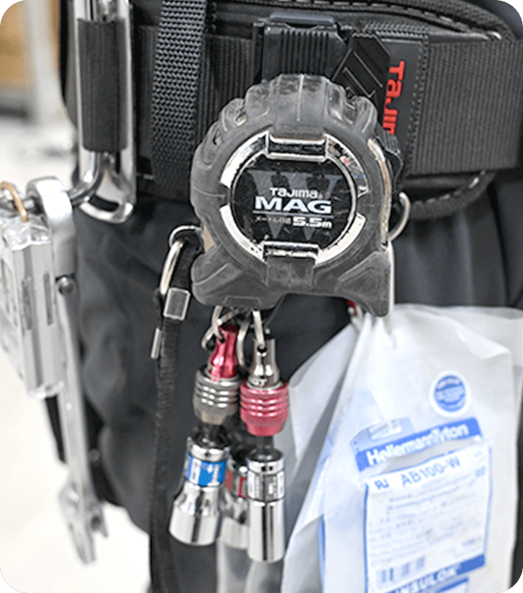 「常に技術向上に努め、お客様の信頼に応えます」という理念のもと、創業以来培ってきた電気工事のノウハウはもちろん、協力会社から学ぶ最新技術、分電盤・制御盤などの設計スキルまで、電気設備を基軸として技術の幅を日進月歩で広げ続けています。