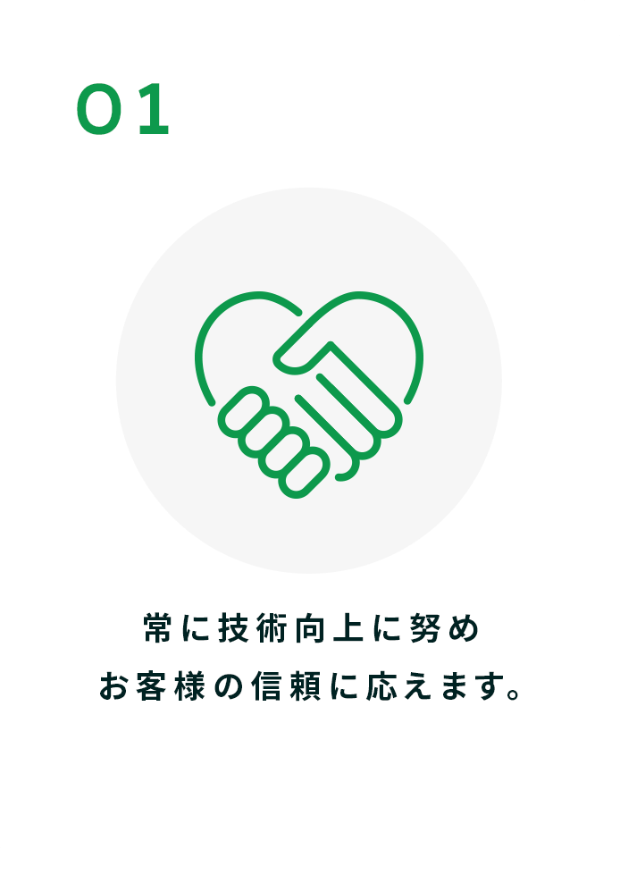 弊社の最大の武器は、技術力と機動力。最新技術を用いたものから規模の大きな工事まで、近年は多く取り組んでおります。それを支える社員は、まさに弊社の財産です。技術向上への支援はもちろん、働きやすさや業務効率化を図る制度面の増強や、社員の幸福度最大化を図るための環境づくりなど、これまで以上に高品質な工事や教育面に力を注いでいく所存です。