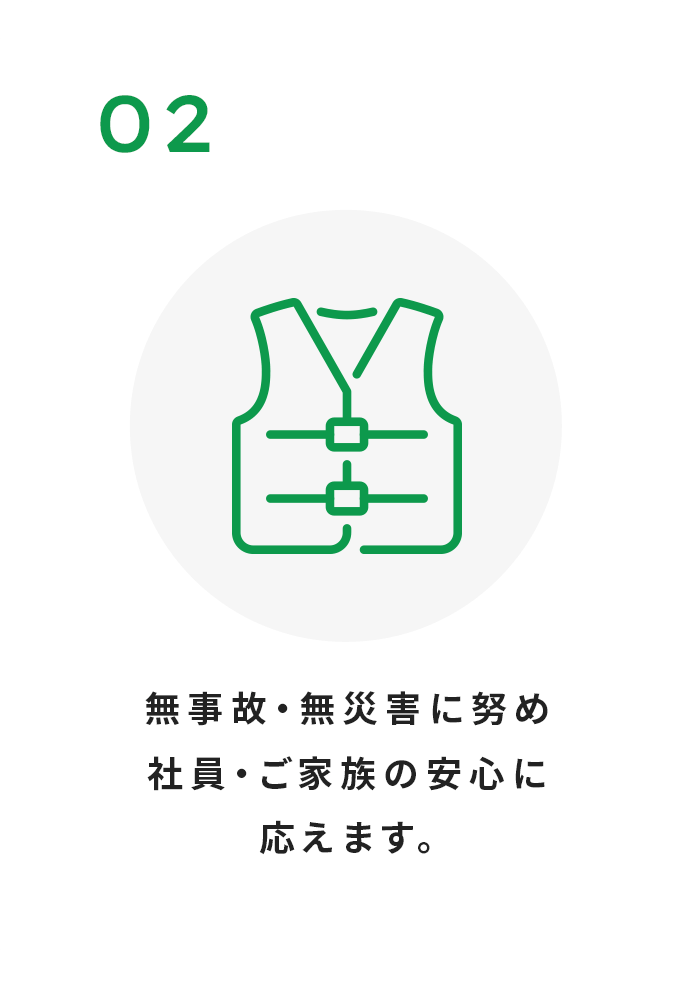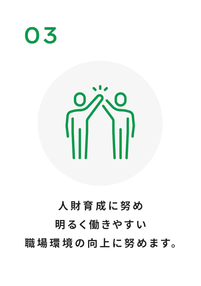 “開かれた経営”のもと、従業員やお取引先様に情報を開示しながら、コンプライアンスの遵守やハラスメントの防止徹底に取り組み、長く働き続けることのできる健全な企業経営をめざします。