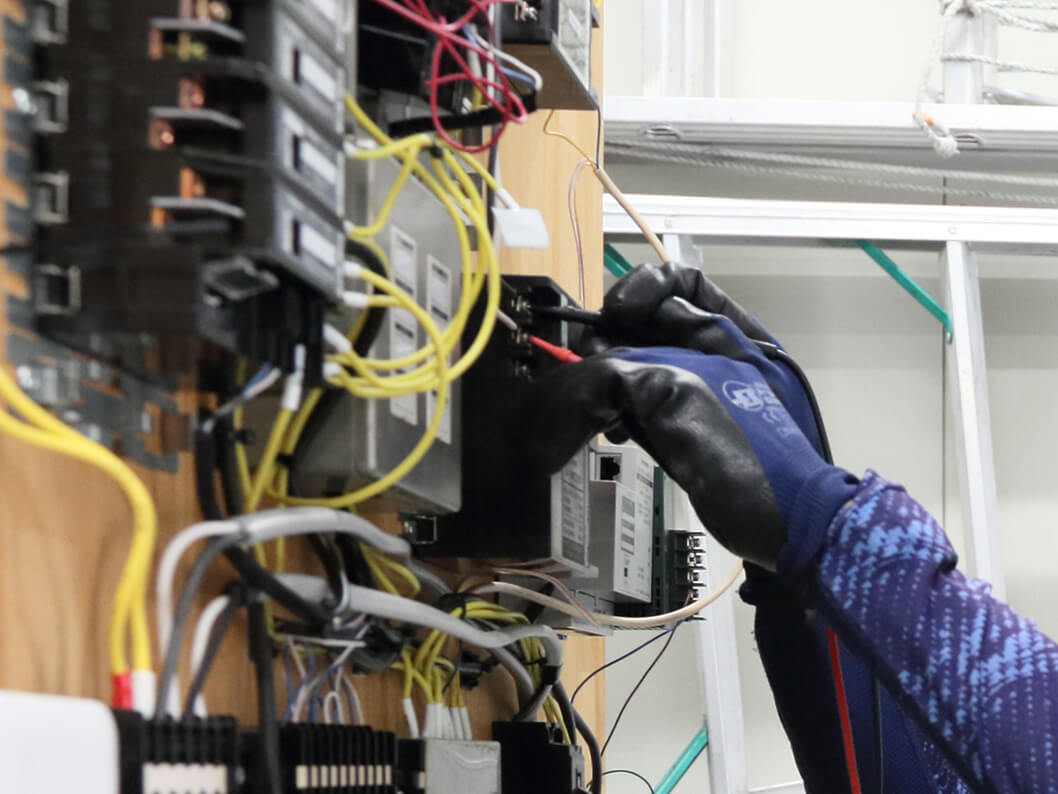 太陽光発電装置の設計・施工も担います。主に、非住宅用の太陽光発電を中心に、パネルや電池、架台などの付帯機器を含めた設置工事を行っております。省エネや創エネといった、次代に向けた持続可能なエネルギー開発も、電気工事で培った経験を活かせる場。設計から携わり、施工まで丁寧に対応いたします。